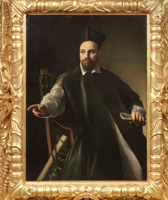 Su una poltrona di scorcio, una mano indica qualcosa ad un interlocutore fuori dalla scena e nel mentre l’altro arto stringe delle carte, la figura del giovane prelato emerge dalla penombra chiaroscurata tipica della pittura del Merisi, con un movimento dinamico che coinvolge l’osservatore. All’interno del percorso pittorico caravaggesco, siamo qui tra il finire del Cinquecento e i primissimi del Seicento, corrispondenti all’età anagrafica del soggetto, nato nel 1568 e che diverrà papa Urbano VIII nel 1623. L’intensità dello sguardo rivela l’attenzione alla resa psicologica della pittura, che sarà sempre più cifra stilistica di Caravaggio.
